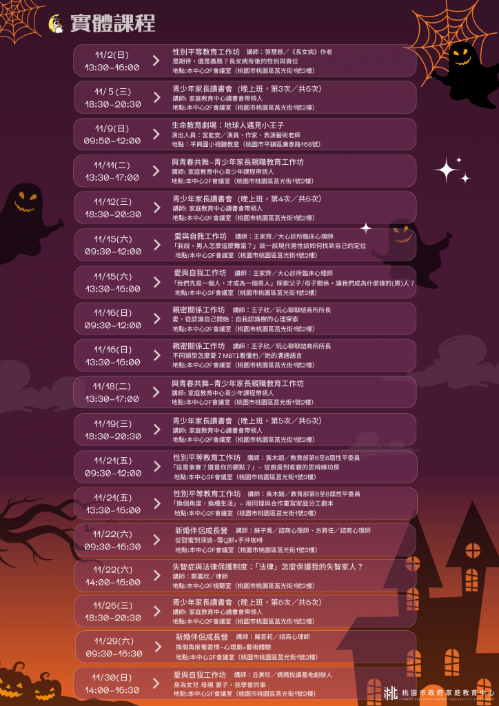 家庭教育中心「小桃家11月課程資訊」、「青少年家長正向教養」、「邁向下一站幸福成長團體」、「學齡前的幸福教養」、「青少年家長親職教育工作坊」海報