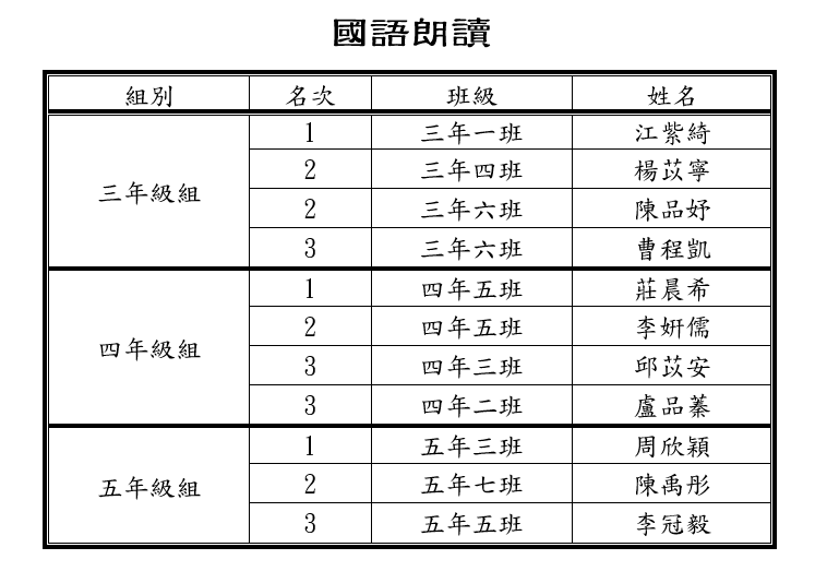 114上校內語文競賽獲獎名單(國語演說.朗讀)